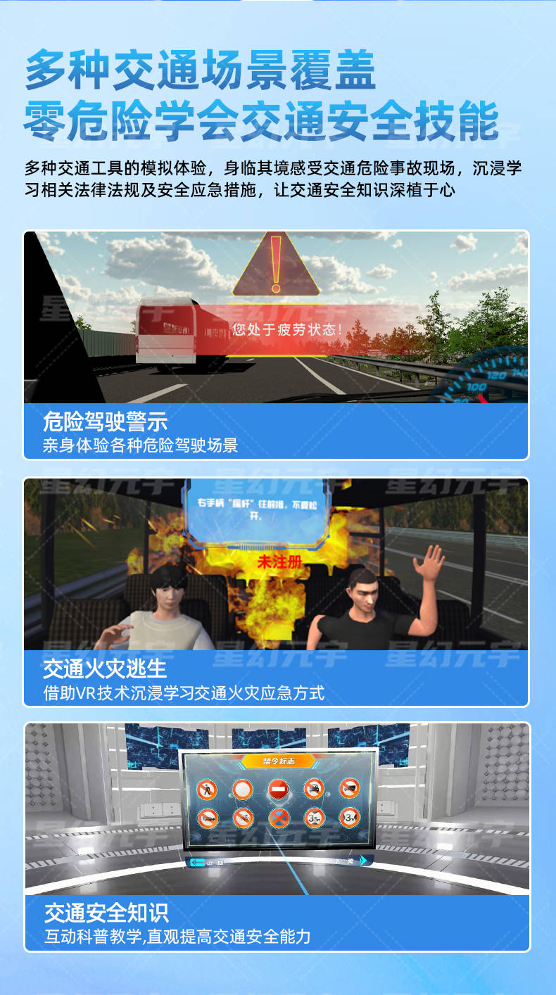 用户佩戴VR设备后,能够置身于城市道路、乡村公路、校园周边等多种交通环境中,直观感受行人、车辆、自行车、电动车等多方互动场景。