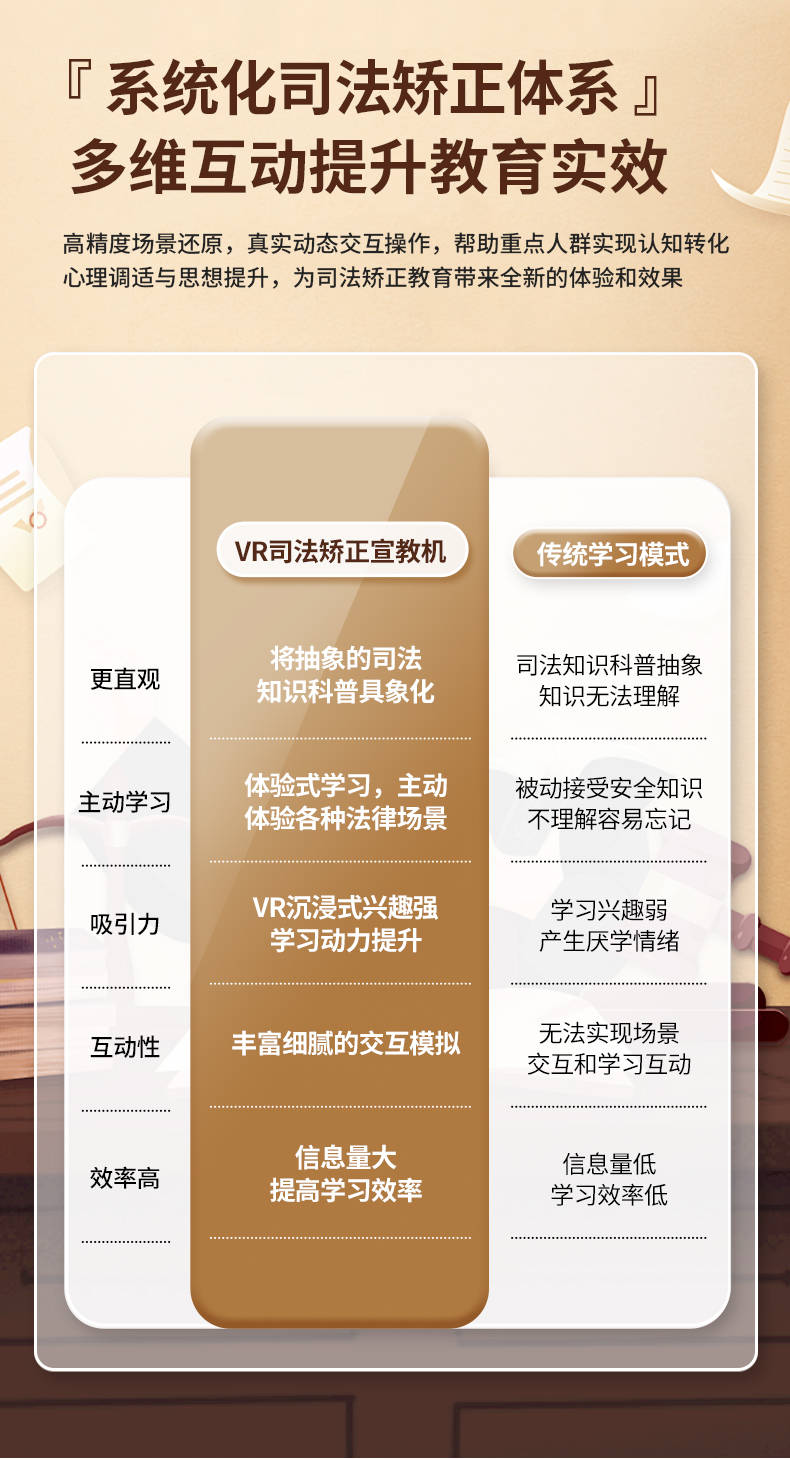 科技的发展让司法教育焕发新活力,VR司法矫正宣教机的出现正是司法宣传与教育方式创新的重要体现。它将“虚拟现实”与“法治宣教”完美结合,让法律教育更具温度与深度。