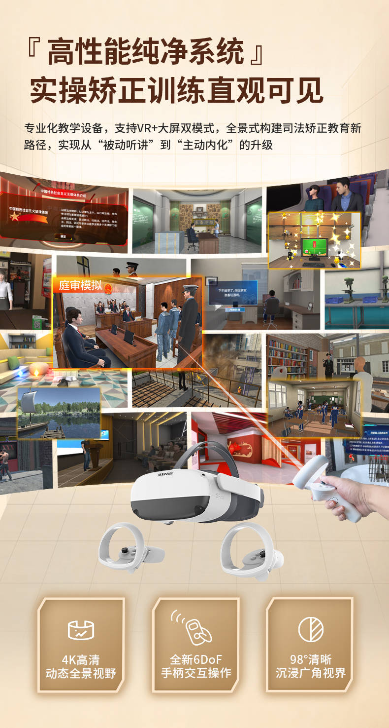 传统的司法矫正教育往往以课堂讲授、视频播放为主,形式单一、效果有限。而VR司法矫正宣教机以虚拟现实技术为核心,突破空间限制,将复杂的司法场景、社会案例和心理引导内容融入沉浸式体验中,让体验者在“亲历”的过程中感悟法律的尊严与底线。