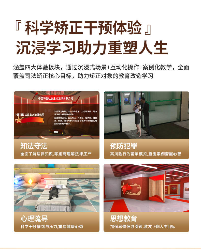 其设计理念源于“以体验促认知、以互动促反思”,通过科技化、情景化、可感化的教育手段,帮助服刑人员、社区矫正人员、社会公众等群体更直观地理解违法成本与守法意义,从而实现“惩教与教育并重”的目标。