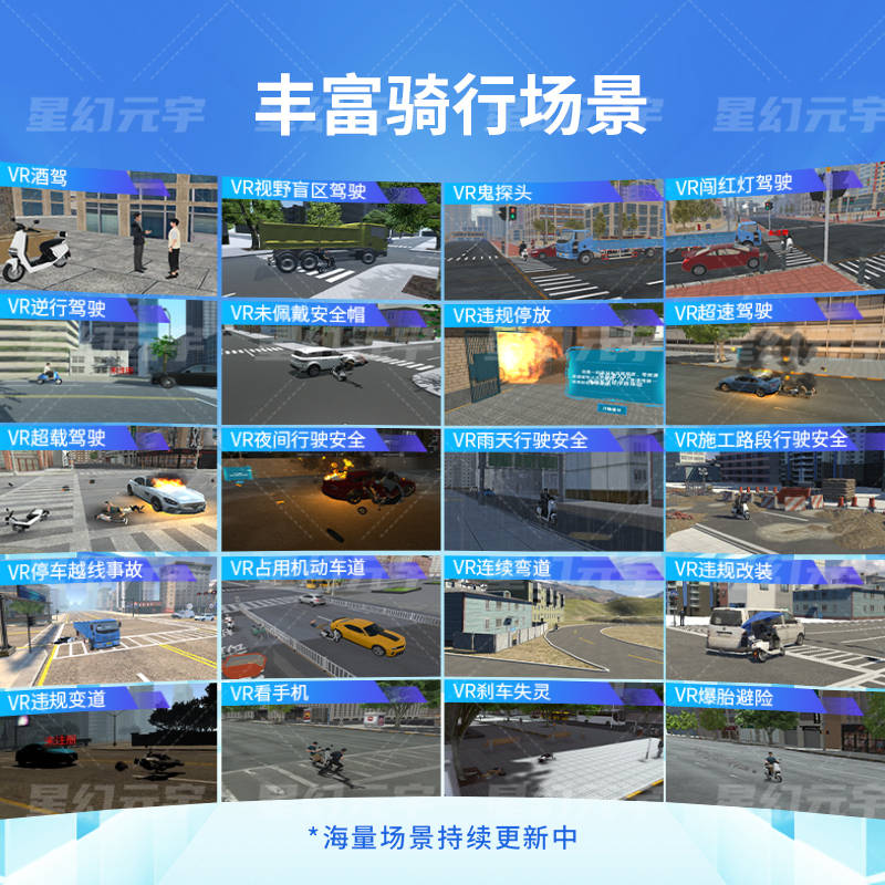 VR电动车系统不仅适用于青少年交通安全教育,也同样适合电动车使用频率高的上班族、外卖骑手、快递员等群体。根据不同场景,系统的学习内容可以灵活定制,如: