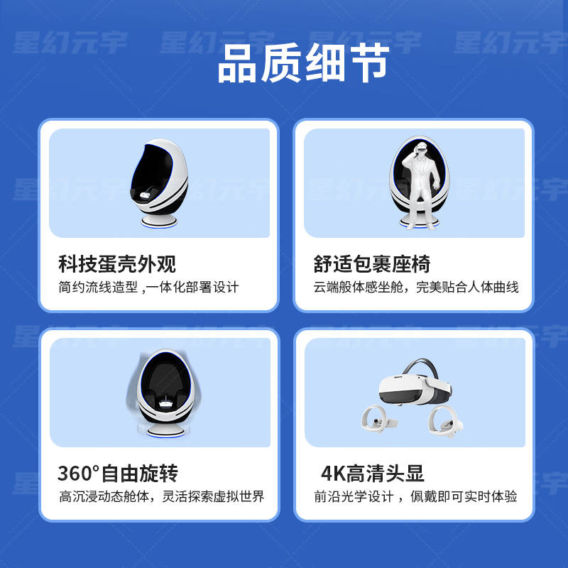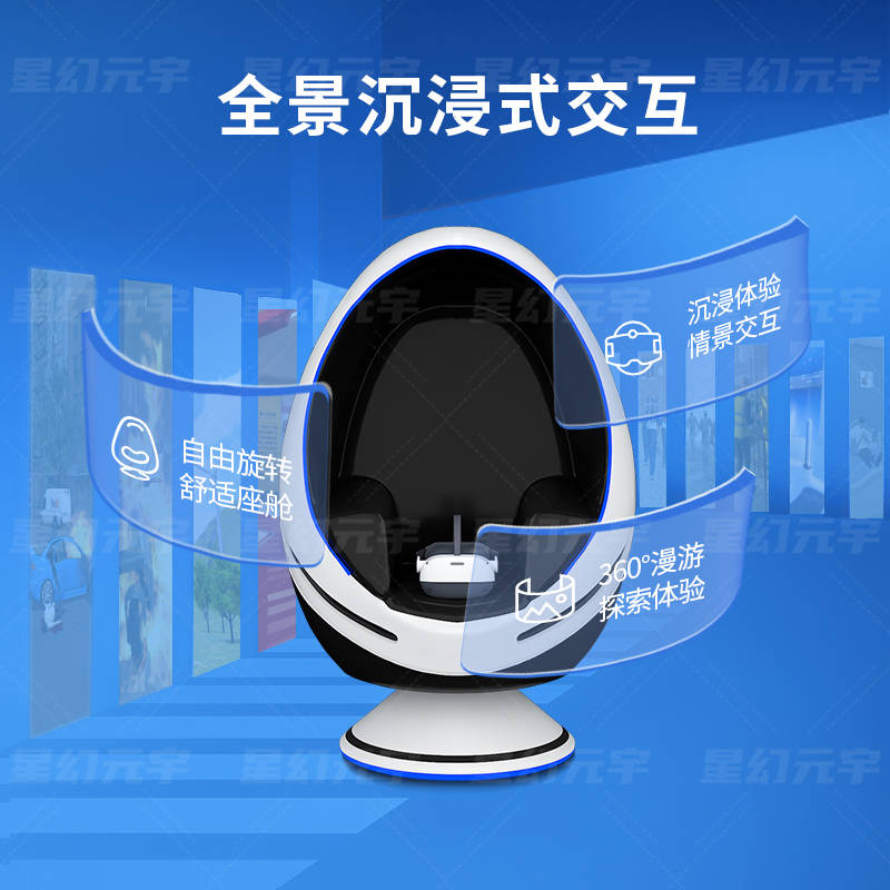 VR旋转蛋椅外形采用椭圆封闭式设计,座舱包裹性强,能够有效隔离外界干扰,让体验者专注于虚拟场景中的沉浸互动。设备通常配备高分辨率VR头显、三自由度或六自由度动感系统、旋转机构、安全固定装置、音响系统等。
