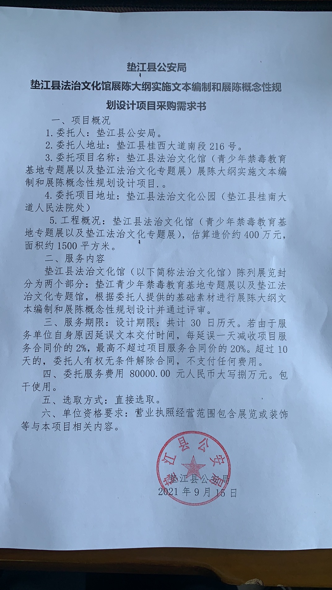 项目名称 | 垫江县法治文化馆展陈大纲实施文本编制和展陈概念性规划设计项目采购需求书 |