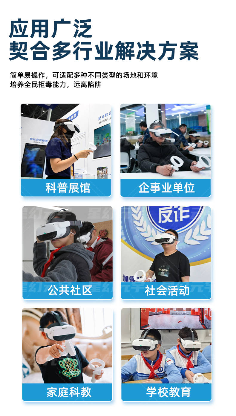 VR禁毒学习机不仅适用于中小学校的青少年禁毒教育,也可用于社区、企事业单位、禁毒展厅、戒毒所等场所,覆盖面广,适应性强。