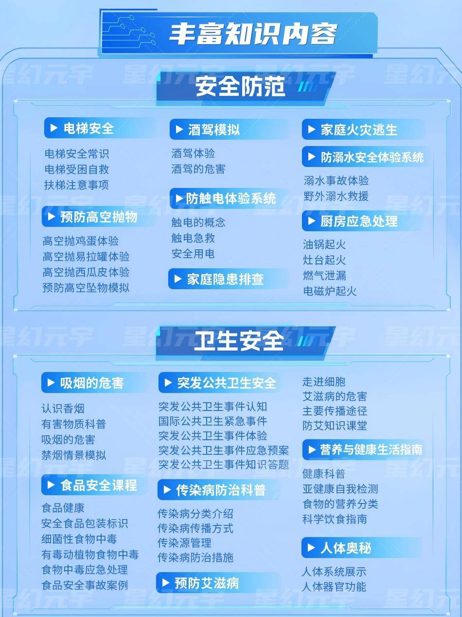 VR社区安全学习机不仅局限于单一主题,而是涵盖了社区安全的各个方面,内容设计科学且实用,适用于不同年龄层的体验者。其主要包括: