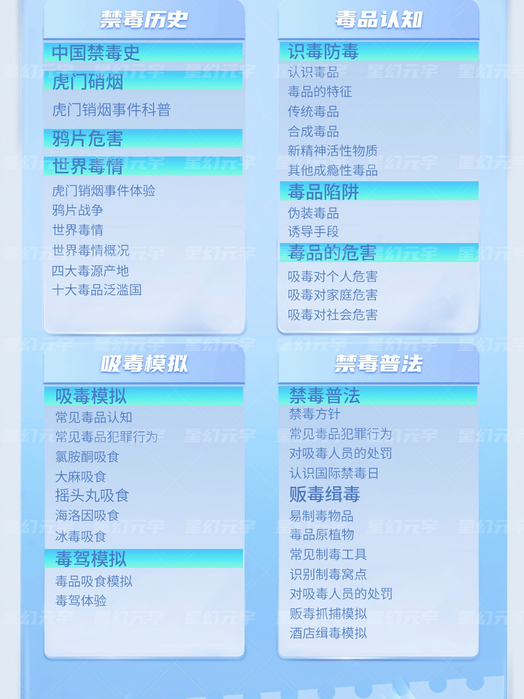 VR禁毒学习机并不是单纯的情景体验,它还包含系统的知识介绍与互动学习模块。内容一般包括: