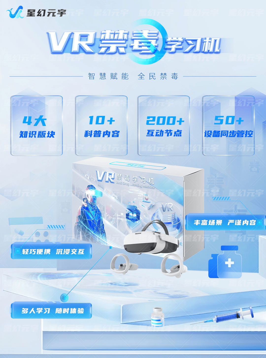 过去的禁毒宣传多为静态图文和说教式讲解,受众在接受信息时往往难以产生代入感,宣教效果有限。VR禁毒学习机通过精心构建的沉浸式虚拟场景,可以模拟吸毒场景、戒毒痛苦过程、家庭崩塌、社会危害等真实情境。体验者戴上VR头显后,可进入多个虚拟剧情场景,在交互与选择中体验毒品带来的连锁性影响,从而做到“身临其境、感同身受”。这种教育方式相比传统宣讲更具冲击力,更能激发内心深处对毒品的抗拒意识。