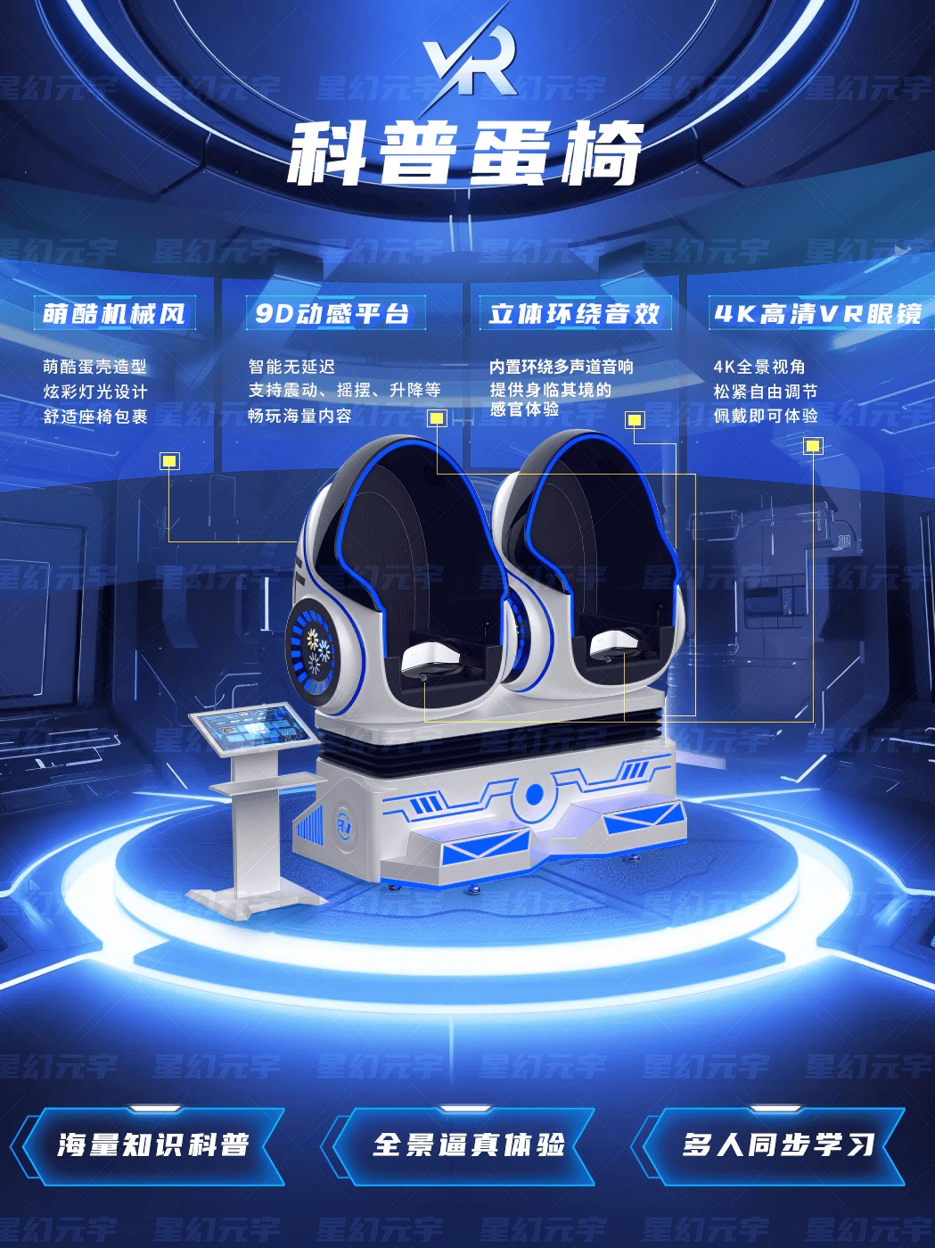 教育内容丰富:VR科普蛋椅不仅可以播放科普视频,还能结合游戏化互动、知识问答等多种形式,提升用户学习兴趣。