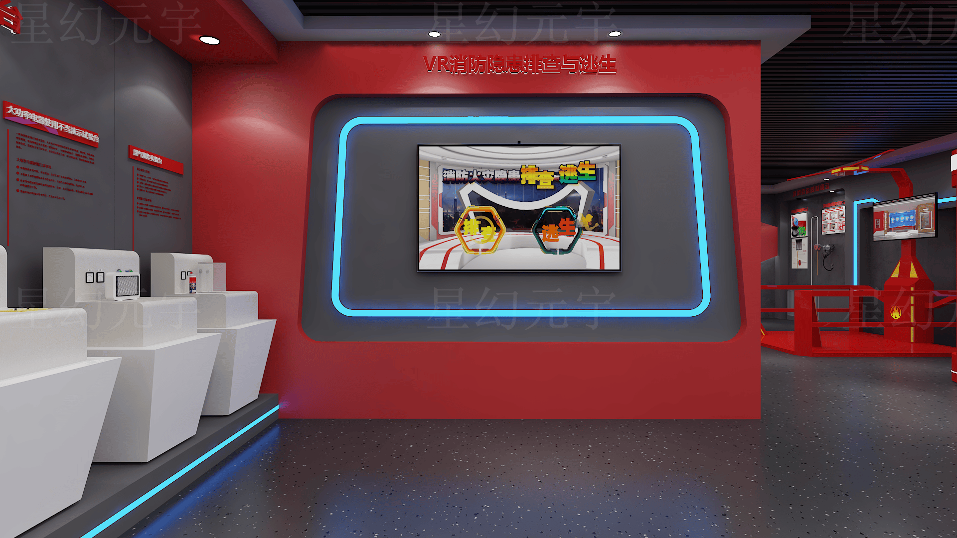 利用VR头显,体验者可进入多种火灾场景,如商场、学校、车库、电动车自燃等,从第一视角学习应急行为。
