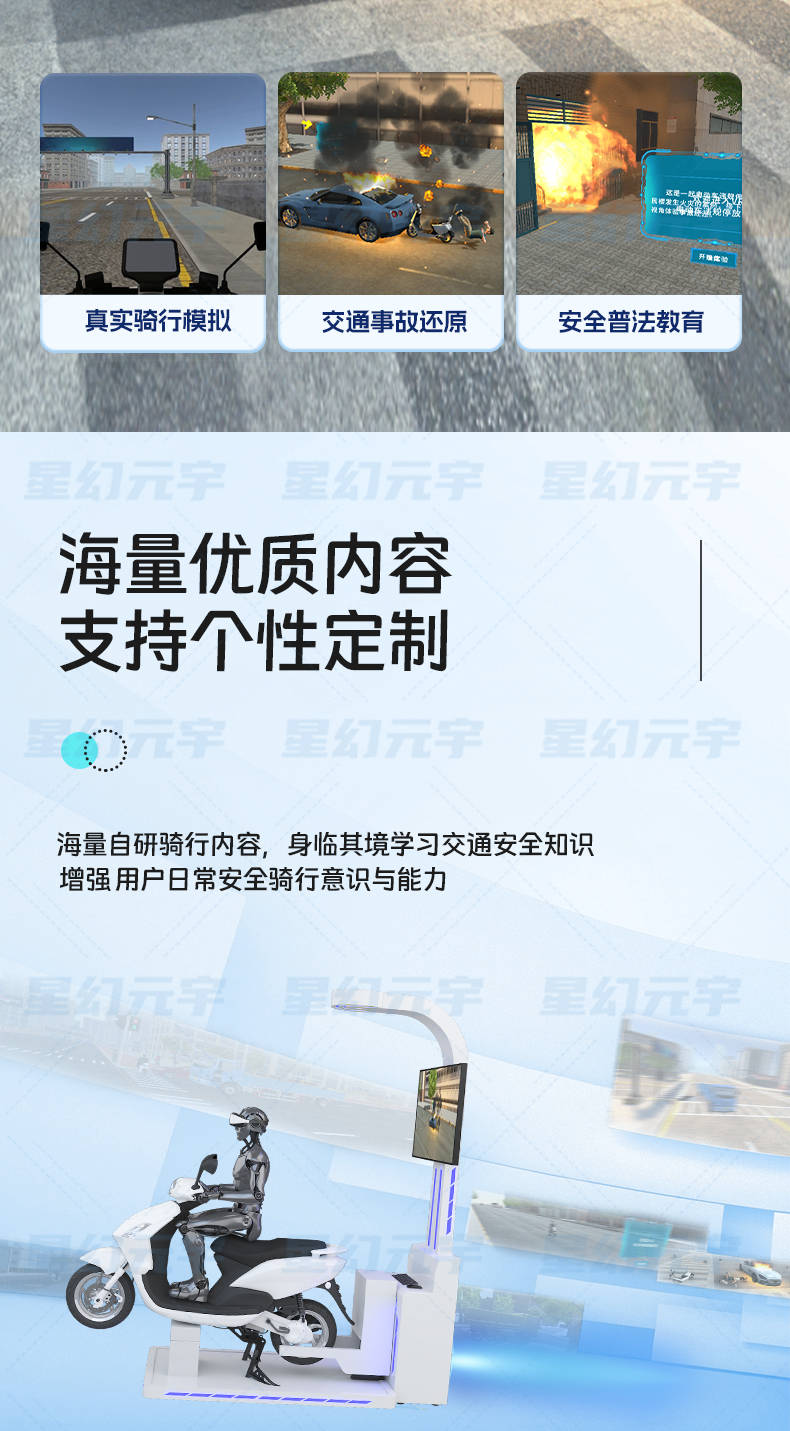 在强调安全、规范、文明出行的同时,这类设备也让公众意识到,科技不仅服务于效率与速度,更可以服务于生命安全与社会秩序。通过沉浸式体验,让安全理念真正走进人心,是VR动感电动车在交通安全科普领域的重要价值所在。
