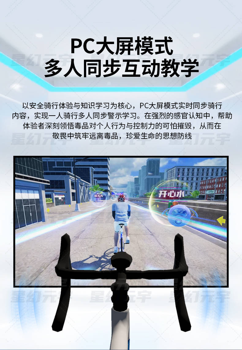 VR禁毒骑行是一套基于动感单车与虚拟现实技术打造的互动教育设备。体验者佩戴VR头显,骑上动感单车,随着踏频变化,虚拟画面同步前进。系统通过高度还原的虚拟场景,引导体验者进入禁毒主题内容,包括毒品认知、成瘾机制、社会危害以及真实案例警示等。
