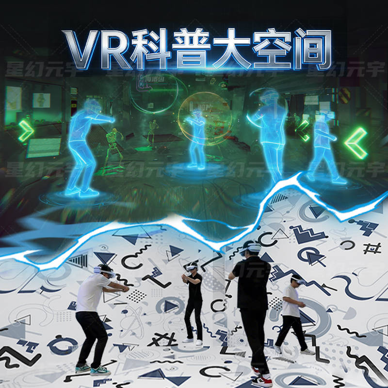 VR科普大空间,通常指在较大实景空间内,通过多套VR设备、统一内容系统与沉浸式交互设计,构建可多人同时体验的虚拟科普环境。体验者佩戴VR头显后,可在限定区域内自由移动,通过任务引导、情景互动、角色代入等方式,深入了解相关科普知识。
