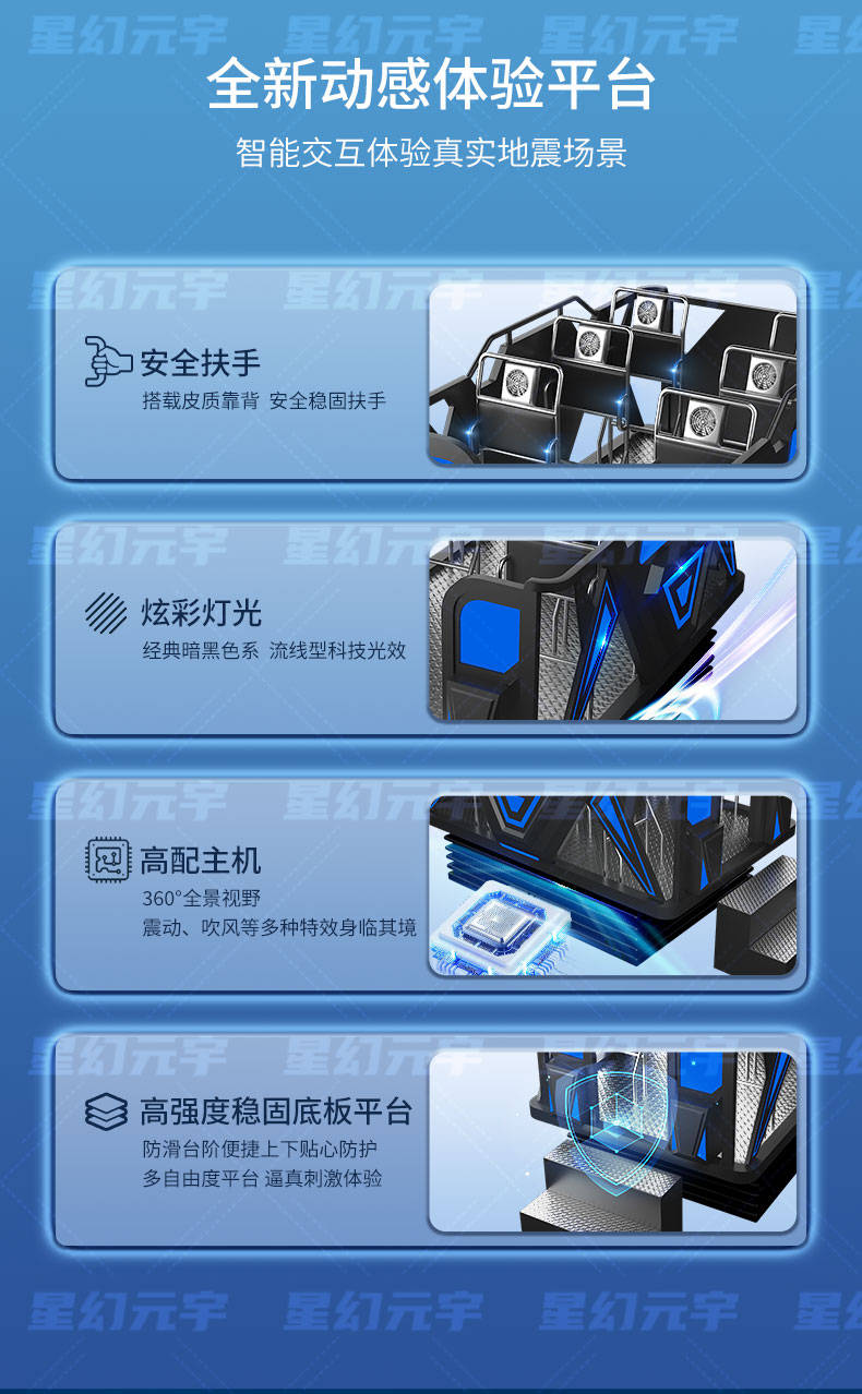 VR地震模拟平台是将虚拟现实技术、动态模拟技术与安全科普教育相结合的一种互动体验设备。体验者佩戴VR头显后,系统会呈现出高度还原的地震场景,例如家庭、教室、办公楼或商场等环境。当“地震”发生时,平台会根据不同震级模拟地面晃动、建筑摇晃、物品坠落等真实情况,让体验者在沉浸式环境中感受地震带来的震动和紧张氛围。