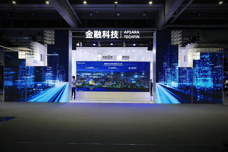 本次云栖大会蚂蚁金服的展台以“码上城市”为设计概念,突出普惠 科技成就金融生活之美的主题。外墙用了科技城市的影像与建筑结构 轮廓相结合,虚实结合。展位里面把城市与展项相结合,在有限的空 间里面放大视觉张力,吸人眼球。